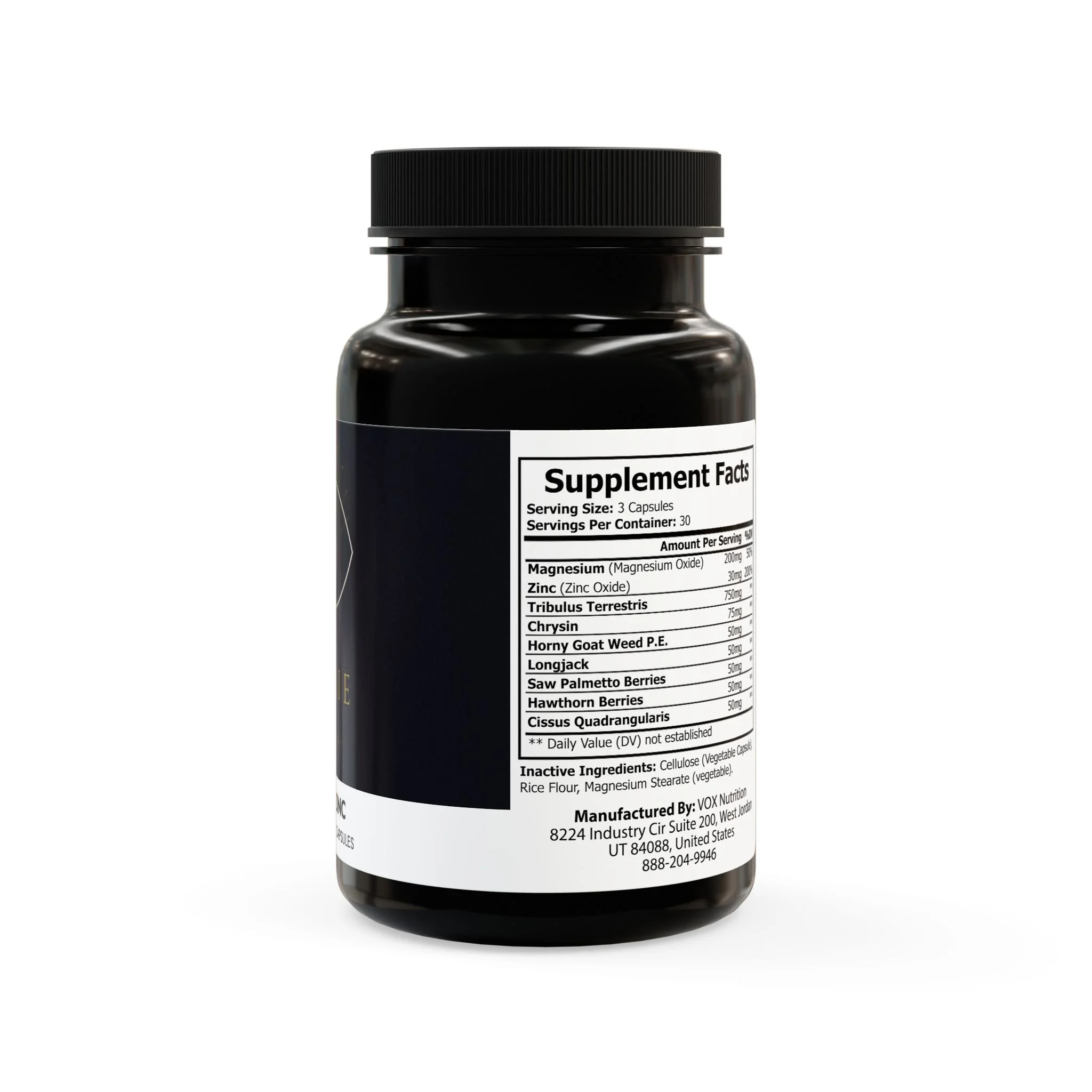 Ingredients: Magnesium (Magnesium Oxide), Zinc (Zinc Oxide), Tribulus Terrestris, Chrysin, Horny Goat Weed P.E., Longjack, Saw Palmetto Berries, Hawthorn Berries, Cissus Quadrangularis Inactive Ingredients: Cellulose (Vegetable Capsule), Rice Flour, Magnesium Stearate (vegetable)
